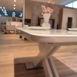 Zgornja plošča mize je izdelana iz stekla, ki je obstojno tudi na visoke temperature in omogoča enostavno čiščenje in brezhiben izgled mize.